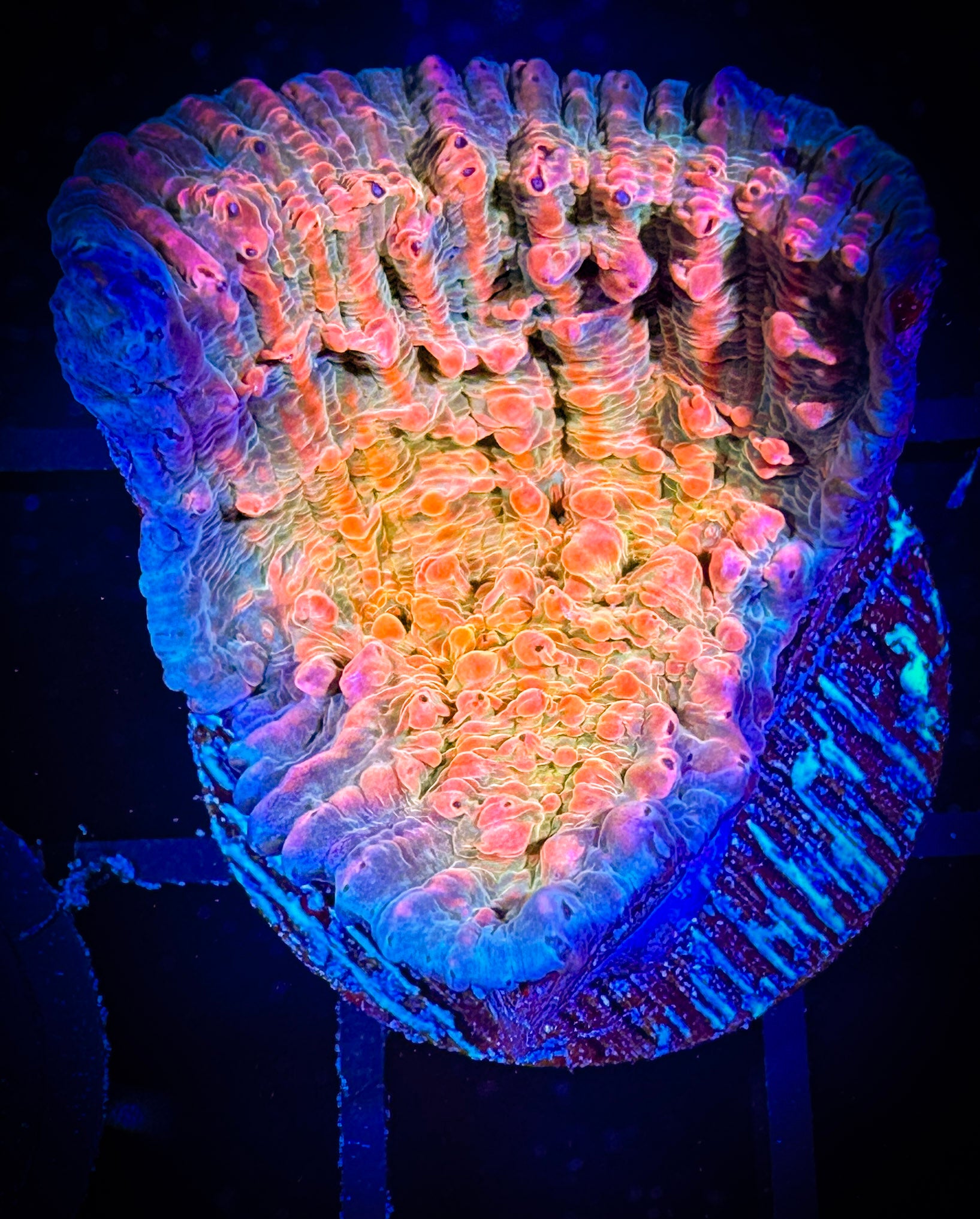 The Dragonfruit Cupping Chalice is a visually stunning coral that will bring a touch of exotic beauty to your reef tank. With its striking, vibrant colors reminiscent of the dragonfruit fruit, this chalice features a rich, deep purple and pink base accented with brilliant orange hues that seem to glow under the right lighting. Its unique "cupping" form, where the coral grows in a bowl-like shape, adds an extra dimension to its allure.