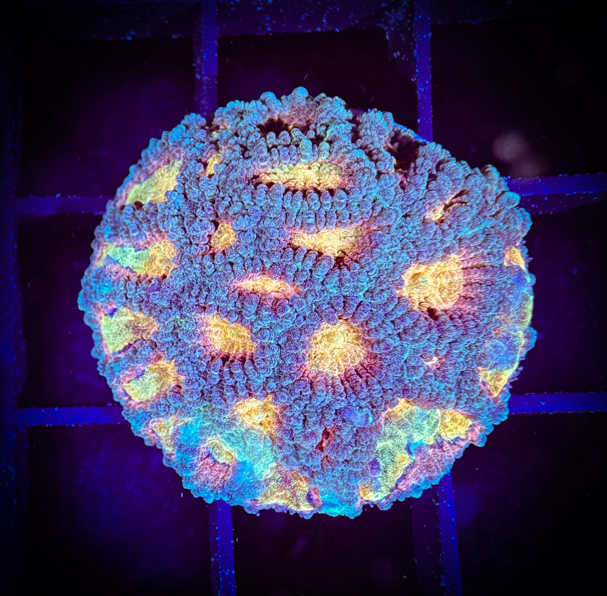 This LPS coral forms circular, encrusting to massive colonies with bold contrasting colors like orange, blue, and green in the polyps against a vibrant base.