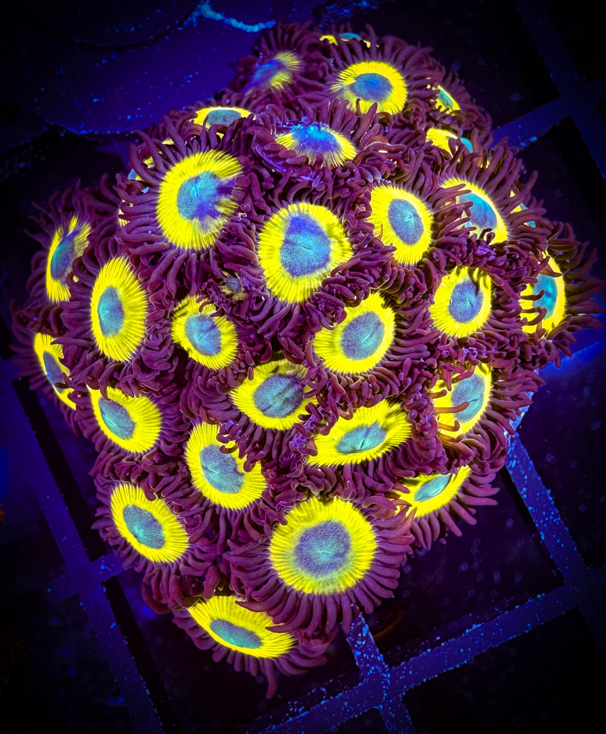 Black Bella Zoanthids have a blue mouth, Yellow face, and a dark purple skirt.