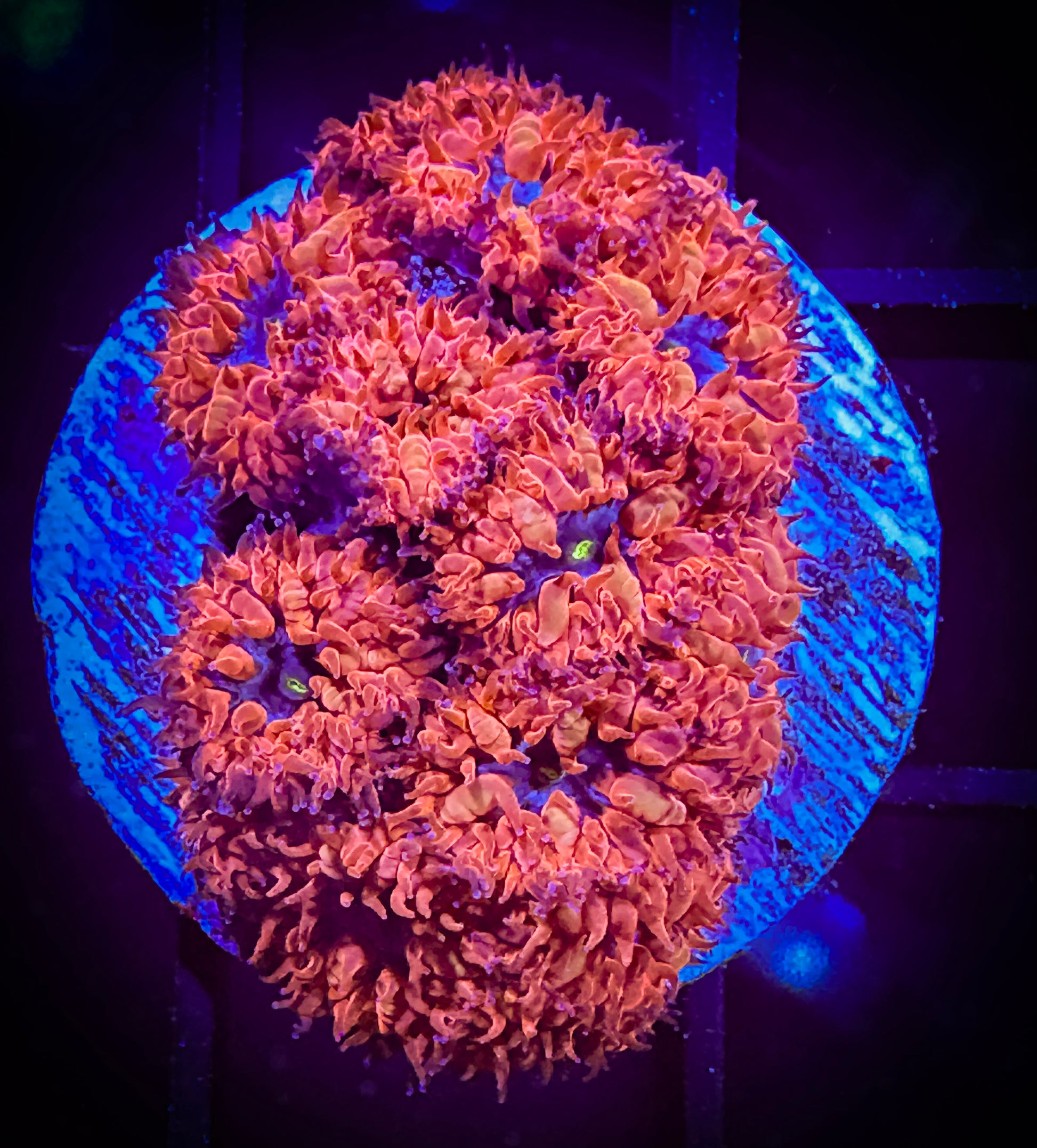 Blue Raven Blastomussa Merleti is a striking coral with a neon red body and a vibrant splash of blue across its face. It also features gold tones running throughout its body, adding to its visual appeal. This captivating combination of colors creates a stunning and eye-catching display in reef aquariums.