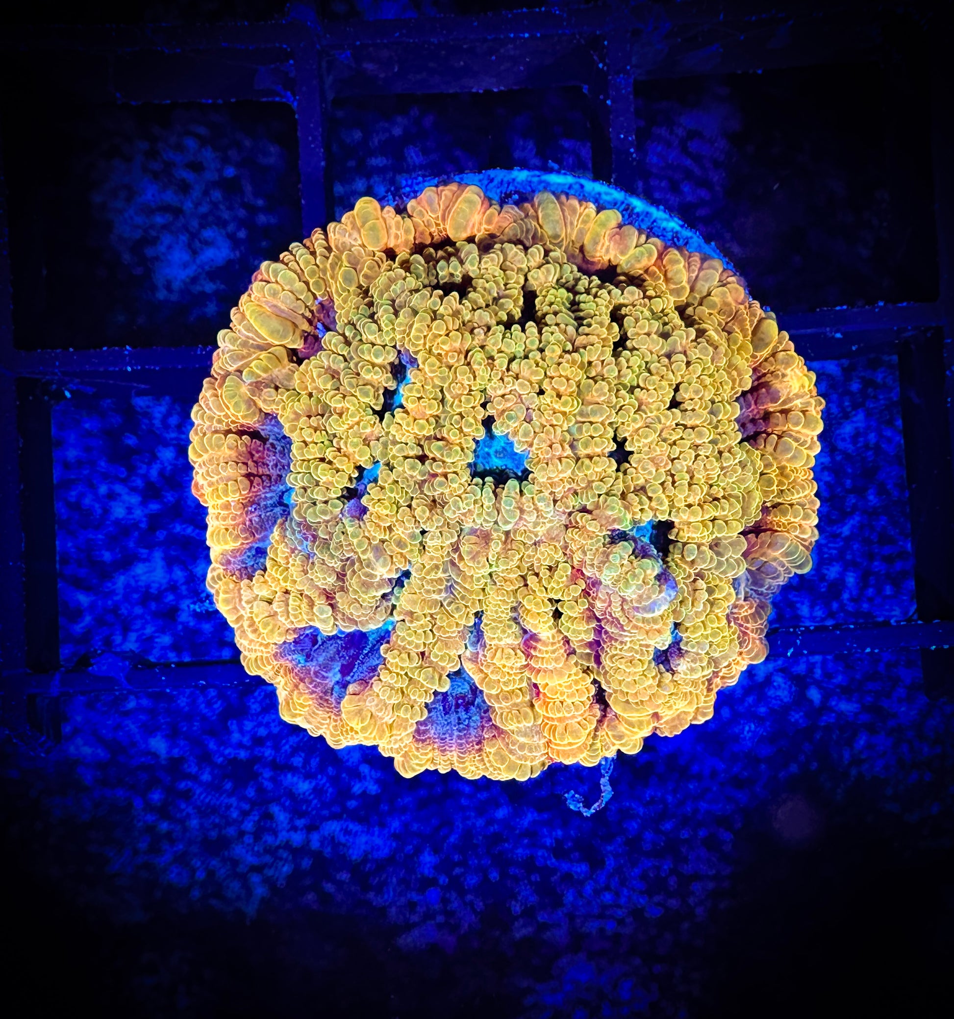 Cali Kid Electric Daisy Favia is a vibrant and eye-catching LPS coral known for its stunning electric yellow-orange polyps with bright green centers. The coral showcases a dense, brain-like structure with exaggerated, bulbous mouths that enhance its unique texture and depth. It is a hardy coral that thrives under moderate lighting and water flow, making it suitable for reef keepers seeking a bold pop of color and interesting form. Its lively hues and dynamic polyp shapes make it a striking centerpiece in any reef aquarium.