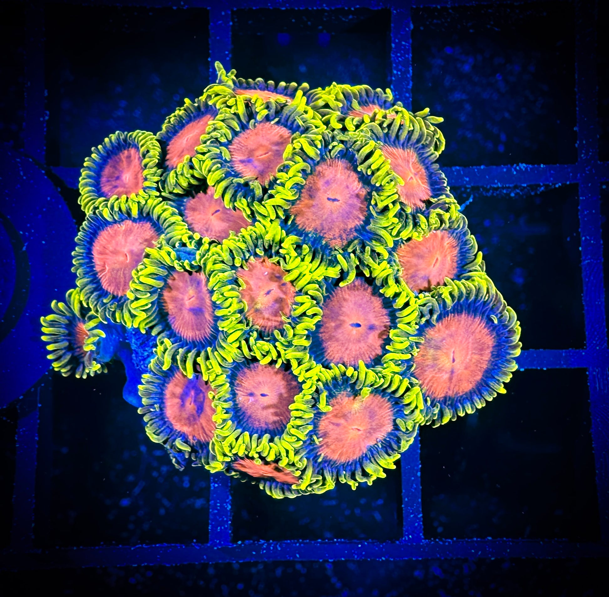 A true classic in the hobby, and these are the OG-- Dragon Eye Zoanthids. A Bright orange face, blue ring, and yellow skirt. I believe they are also called yellow brick roads.