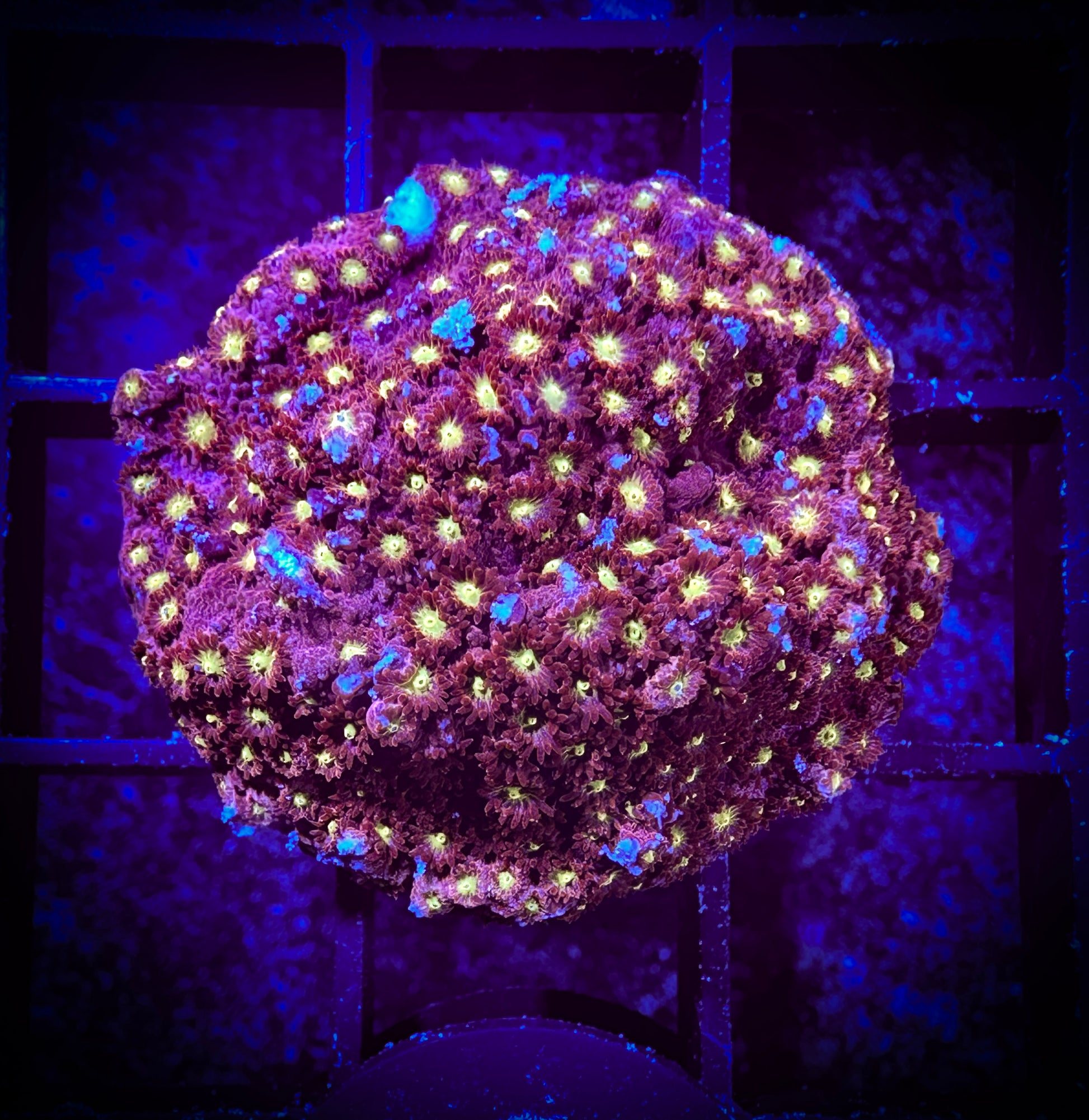 Bling Bling Cyphastrea is a visually captivating coral species with a fuchsia-colored base and vibrant yellow polyps. It is a lower light, encrusting coral that grows well in lower light. Blue lighting brings out its color vibrancy, but it holds up pretty well in white light as well.