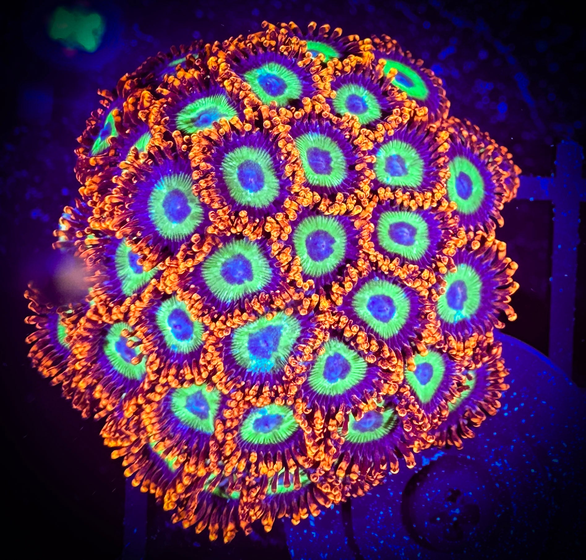 They're like Fruitloops with green instead of yellow. Emeralds on Fire Zoanthids are a seldom found delight with Blue centers, emerald green face, blue ring, and a red skirt.