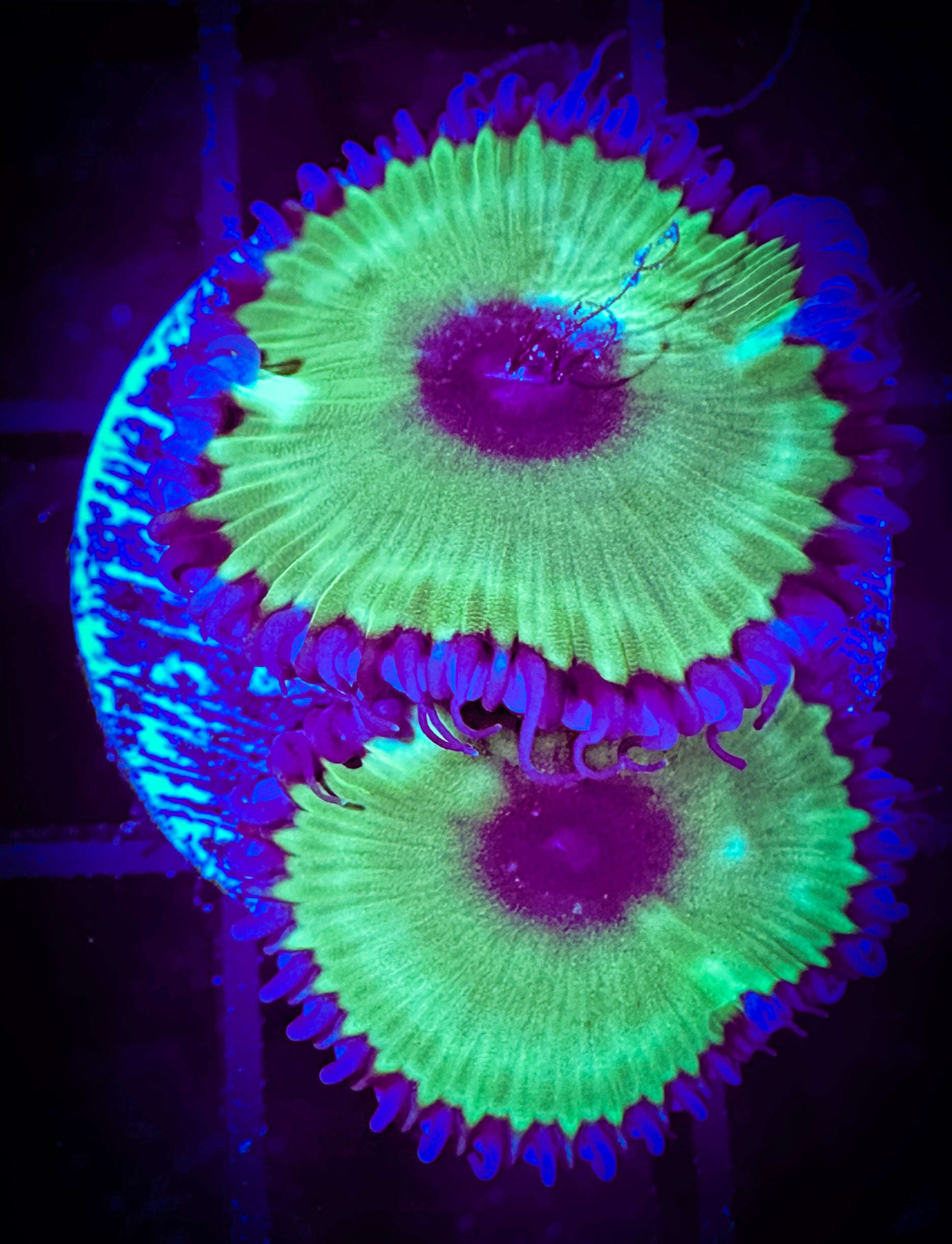 The Palythoa grandis is the largest of the button polyps with some approaching 1.5"- 2" in diameter. Typically, the lower the light, the larger the Paly.