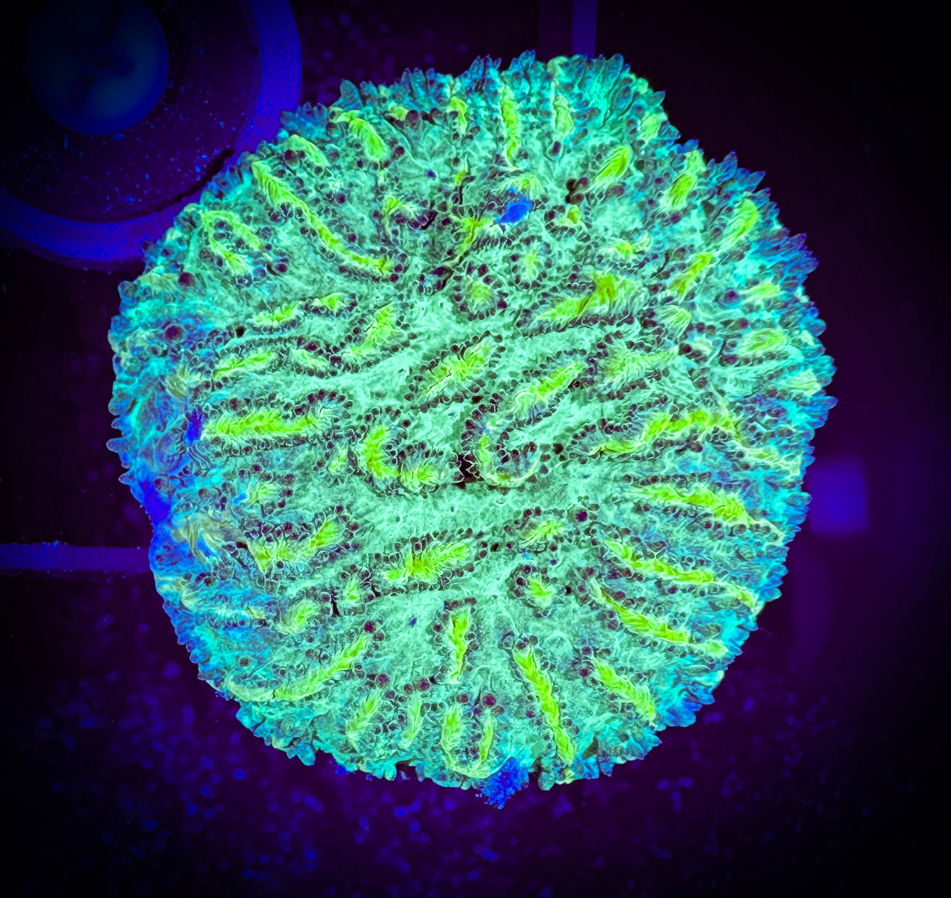 This Hydnophora (also called a horn coral) can be seen from across the room. Very few corals are as bright, and it has an interesting growth pattern. At first it encrusts the rock, then it tables, and finally it grows up in mass. A truly florescent green with multiple shades. This coral can be aggressive, so watch your placement. It cannot extend to harm other corals, but if it grows into a neighbor, it can sting them.