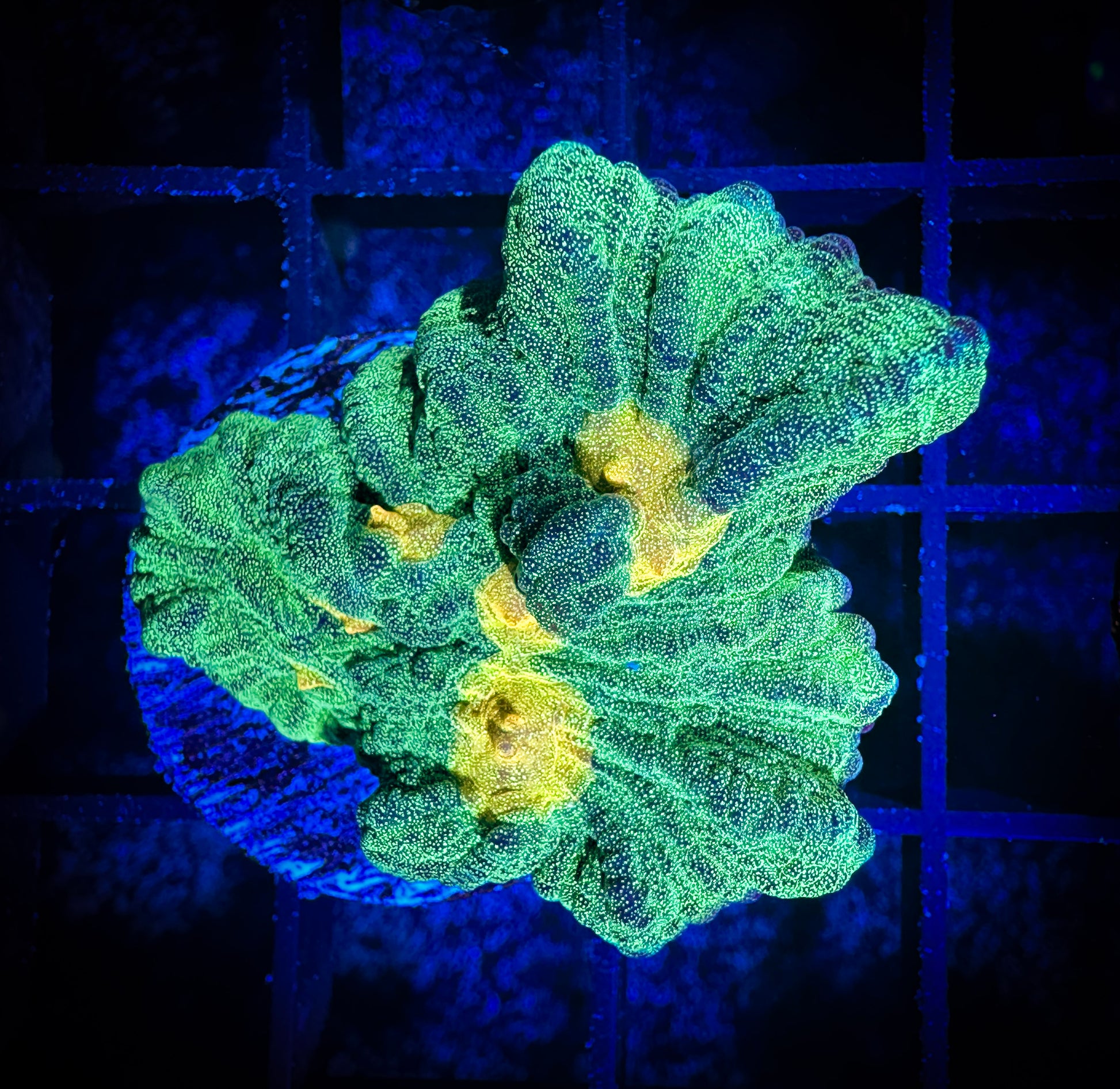 Space Invader Pectinia, scientifically known as Pectinia lactuca, is a captivating coral variety known for its unique and otherworldly appearance. The bright neon base color together with its striking yellow eyes can be seen from across the room. Pectinia grow vertical branches, and over time, they typically develop into a formation that looks like a hand.