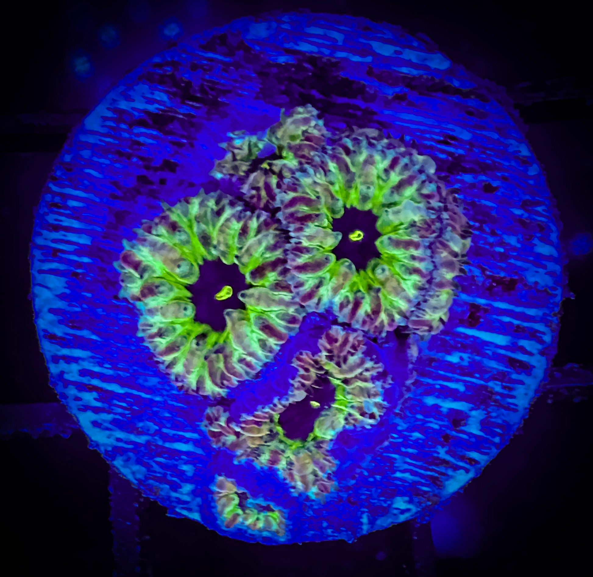 Master PPE Blastomussa Merletti is a premium, aquacultured LPS coral prized for its intense purple coloration and bright green highlights. Hardy and beginner-friendly, it thrives under low to moderate lighting with gentle flow, making it an excellent choice for nano and mixed reef aquariums. A standout show coral that adds rich color and texture to any reef setup. A really unique variety. Blastos can be great in a corner becuase they eventually grow into a ball formation, and they don't require a lot of light.