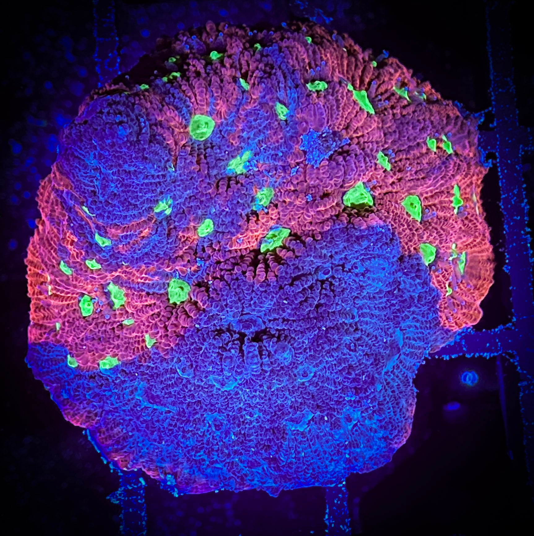 A unique War Coral (Favaities) of the encrusting variety. This one is a hybrid Hot and Cold War together with a blue variety.